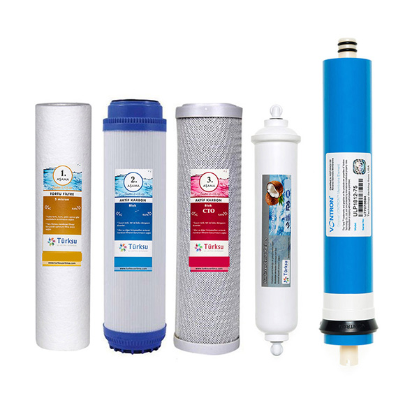 1. Aşama Filtresi 5 Micron Tortu Filtresi : 5 mikron tortu filtre, ters ozmos filtrasyonunun ilk aşamasıdır. Filtrasyonun başlangıcında, suda bulunan kaba tortu, kum, mil, çamur gibi maddelerin arıtılmasını sağlayarak ters ozmos membran filtreyi korur ve optimum filtre ömrü sağlar. Kullanım ömrü 6-8 aydır. Suyun kullanımına göre değişiklik gösterebilir. 6 ton su kullanıldığında ömrü dolar ve yenisiyle değişmesi gerekmektedir. 2. Aşama Filtresi GAC Granül Aktif Karbon Filtresi : Granül Aktif Karbon filtre, ters ozmos filtrasyonun ikinci aşamasıdır. Suyun renk, tat ve koku dengesini düzenler. Kaliteli içme suyunda bulunmaması gereken klor ve diğer kimyasal maddeleri arıtarak membran filtreyi korur ve ters ozmos işleminin kusursuz olarak gerçekleşmesini sağlar. Kullanım ömrü 6-8 Aydır.suyun kullanımına göre de değişiklik gösterebilir. 6 ton su kullanıldığında ömrü dolar ve yenisiyle değişmesi gerekmektedir. 3. Aşama Filtresi CTO Karbon Blok filtresi: CTO karbon blok filtre, ters ozmos filtrasyonun ikinci aşamasıdır. Suyun renk, tat ve koku dengesini düzenler. Kaliteli içme suyunda bulunmaması gereken klor ve diğer kimyasal maddeleri arıtarak membran filtreyi korur ve ters ozmos işleminin kusursuz olarak gerçekleşmesini sağlar. Kullanım ömrü 6-8 Aydır. suyun kullanımına göre de değişiklik gösterebilir. 6 ton su kullanıldığında ömrü dolar ve yenisiyle değişmesi gerekmektedir. 4. Aşama Ters Ozmoz (Reverse Osmosis) Membranı 80 GPD (PLATINUM): Yüksek kaliteli ters ozmoz membranı suyun sertliğini ve suyunuzda bulunabilecek kurşun, baryum, krom, civa, sodyum, kadminyum, florür, nitrit, ve selenyum gibi kirletici maddeleri arıtır.Membran filtre, ters ozmos filtrasyonunun dördüncü ve en önemli aşamasıdır. Membran filtre, ters ozmos işlemini gerçekleştirerek suyun yarı geçirgen zar olan membran dan yüksek basınç yardımı ile geçirilerek suyun nano tortu, partikül,ağır metal, kimyasal, virüs, bakteri, mikro organizma ve kireç gibi maddelerden arıtılmasını sağlar. İdeal nitelikte içme suyu üretir. Kullanım ömrü 2-4 Yıldır. suyun kullanımına göre de değişiklik gösterebilir. 15 ton su kullanıldığında ömrü dolar ve yenisiyle değişmesi gerekmektedir. 5.Aşama Post Carbon Filtre : Suda bulunan klor,renk,tat ve koku veren eriyik gazlar,artıklar ve organik maddelerin arıtımı için kullanılır.Bu aktif granül karbon filtre yüksek performansı aktive edilmiş karbondan oluşmaktadır ve klorun, koku,organik kirleticiler,böcek ilaçları ve koku ile tadı etkileyen kimyasallardan arındırır.Mebran filtreden çıkan su, saflığa yakın olup, içim olarak hamdır.Birçoğumuz bu suyun tadını beğenmeyiz. Post karbon filtre ile bu hamlıktan çıkar, içimi hoş bir hale gelir. Bir dağ kaynağından çıkan su gibi bir hale ulaşır. Gümüş iyonlar sayesinde bakteri oluşumunu engeller. Tatlandırıcı post karbon filtre %10 gümüş iyon içerir gümüş iyonlu post karbon bakteri üremesini engelleyerek temiz su elde etmenizi sağlar gümüş iyonlu post karbon filtresinin ana ham maddesi Hindistan cevizi ve zeytin çekirdeğinden üretilmektedir. Gümüş iyonlu tatlandırıcı post karbon filtrenin kullanım ömrü genelde 12-14 ay süresi vardır. 5 ton su geçirdiğinde post karbonun süresi dolar ve yenisi ile değişim yapılmalıdır.Değişim süresini geçirmemeniz gereklidir. çünkü su en son bu aşamadan geçtiği için suyun tadını oldukça etkilemektedir. # Filtre Değişim Süreleri Hakkında Bilgilendirme # 1 Micron Sediment Filtre: Değişim Süresi 6 İla 8 Ay Arasında Değişmektedir. Cto Block Karbon Filtre: Değişim Süresi 6 İla 8 Ay Arasında Değişmektedir. Gac Karbon Filtre: Değişim Süresi 6 İla 8 Ay Arasında Değişmektedir. Membran 75 GPD: Ortalama Ömrü 1 ila 2 Yıldır. Tatlandırıcı Post Carbon Filtre: Değişim Süresi 12 İla 14 Ay Arasında Değişmektedir.